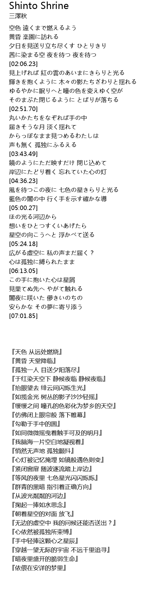 | [02:06.70] | 見上げれば 紅の雲のあいまにきらりと光る |