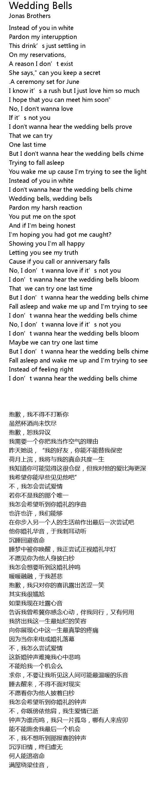 | [03:34.110] | But I don' t wanna hear the wedding bells chime |