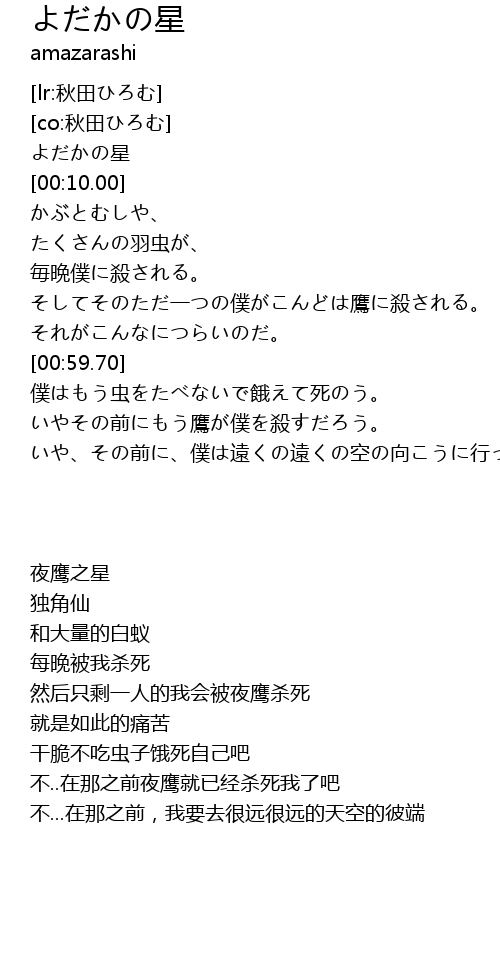 | [01:05.37] | いやその前にもう鷹が僕を殺すだろう。 |