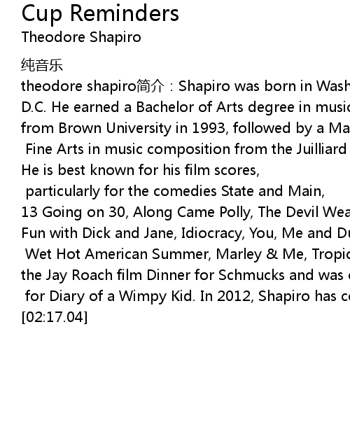 | [00:23.46] | theodore shapiro简介:Shapiro was born in Washington, |