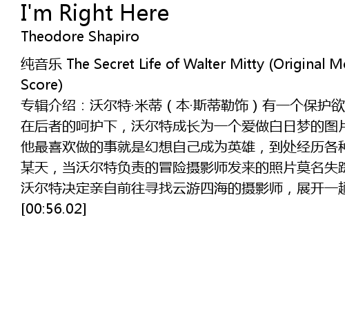 | [00:11.31] | 纯音乐 The Secret Life of Walter Mitty (Original Motion Picture Score) |