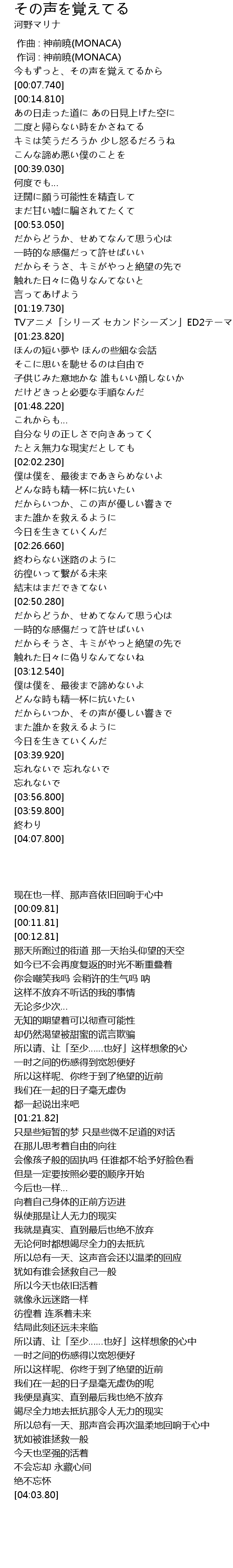 | [00:00.070] | 今もずっと、その声を覚えてるから |