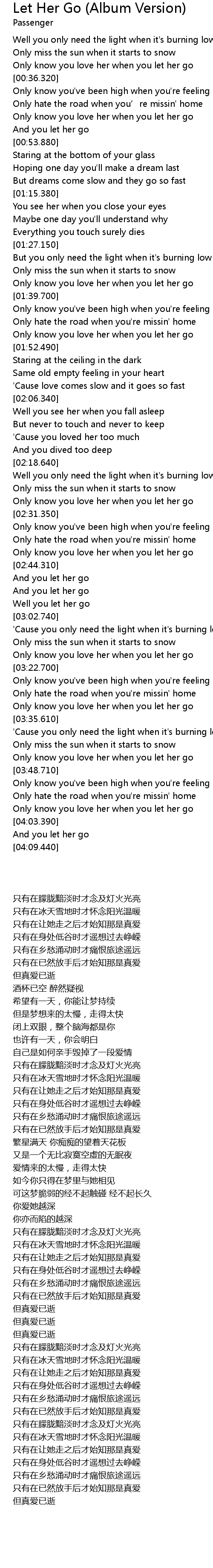 | [03:20.020] | Only know you love her when you let her go |