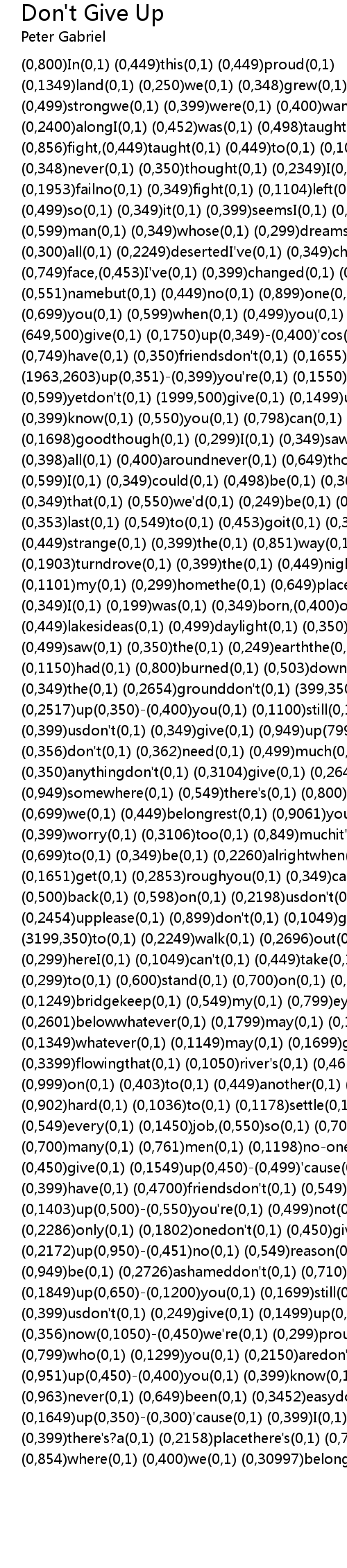 (0,800)In(0,1) (0,449)this(0,1) (0,449)proud(0,1) (0,1349)land(0,1) (0,250)we(0,1) (0,348)grew(0,1) (0,499)up(0,1) (0,499)strongwe(0,1) (0,399)were(0,1) (0,400)wanted(0,1) (0,599)all(0,1) (0,2400)alongI(0,1) (0,452)was(0,1) (0,498)taught(0,1) (0,350)to(0,1) (0,856)fight,(0,449)taught(0,1) (0,449)to(0,1) (0,1049)winI(0,1) (0,348)never(0,1) (0,350)thought(0,1) (0,2349)I(0,1) (0,399)could(0,1) (0,1953)failno(0,1) (0,349)fight(0,1) (0,1104)left(0,1) (0,399)or(0,1) (0,499)so(0,1) (0,349)it(0,1) (0,399)seemsI(0,1) (0,399)am(0,1) (0,549)a(0,1) (0,599)man(0,1) (0,349)whose(0,1) (0,299)dreams(0,1) (0,549)have(0,1) (0,300)all(0,1) (0,2249)desertedI've(0,1) (0,349)changed(0,1) (0,498)my(0,1) (0,749)face,(0,453)I've(0,1) (0,399)changed(0,1) (0,1153)my(0,1) (0,551)namebut(0,1) (0,449)no(0,1) (0,899)one(0,1) (0,549)wants(0,1) (0,699)you(0,1) (0,599)when(0,1) (0,499)you(0,1) (0,2799)losedon't(0,1) (649,500)give(0,1) (0,1750)up(0,349)-(0,400)'cos(0,1) (0,800)you(0,1) (0,749)have(0,1) (0,350)friendsdon't(0,1) (0,1655)give(0,1) (1963,2603)up(0,351)-(0,399)you're(0,1) (0,1550)not(0,1) (0,1403)beaten(0,1) (0,599)yetdon't(0,1) (1999,500)give(0,1) (0,1499)up(600,300)-(0,400)I(0,1) (0,399)know(0,1) (0,550)you(0,1) (0,798)can(0,1) (0,500)make(0,1) (0,949)it(0,1) (0,1698)goodthough(0,1) (0,299)I(0,1) (0,349)saw(0,1) (0,599)it(0,1) (0,398)all(0,1) (0,400)aroundnever(0,1) (0,649)thought(0,1) (0,6019)DID(0,1) (0,599)I(0,1) (0,349)could(0,1) (0,498)be(0,1) (0,300)affectedthought(0,1) (0,349)that(0,1) (0,550)we'd(0,1) (0,249)be(0,1) (0,299)the(0,1) (0,353)last(0,1) (0,549)to(0,1) (0,453)goit(0,1) (0,300)is(0,1) (0,299)so(0,1) (0,449)strange(0,1) (0,399)the(0,1) (0,851)way(0,1) (0,399)things(0,1) (0,1903)turndrove(0,1) (0,399)the(0,1) (0,449)night(0,1) (0,449)toward(0,1) (0,1101)my(0,1) (0,299)homethe(0,1) (0,649)place(0,1) (0,655)that(0,1) (0,349)I(0,1) (0,199)was(0,1) (0,349)born,(0,400)on(0,1) (0,449)the(0,1) (0,449)lakesideas(0,1) (0,499)daylight(0,1) (0,350)broke,(0,299)I(0,1) (0,499)saw(0,1) (0,350)the(0,1) (0,249)earththe(0,1) (0,3803)trees(0,1) (0,1150)had(0,1) (0,800)burned(0,1) (0,503)down(0,1) (0,399)to(0,1) (0,349)the(0,1) (0,2654)grounddon't(0,1) (399,350)give(0,1) (0,2517)up(0,350)-(0,400)you(0,1) (0,1100)still(0,1) (0,4200)have(0,1) (0,399)usdon't(0,1) (0,349)give(0,1) (0,949)up(799,350)-(0,551)we(0,1) (0,356)don't(0,1) (0,362)need(0,1) (0,499)much(0,1) (0,749)of(0,1) (0,350)anythingdon't(0,1) (0,3104)give(0,1) (0,2649)up(0,350)-(0,304)'cause(0,1) (0,949)somewhere(0,1) (0,549)there's(0,1) (0,800)a(0,1) (0,499)placewhere(0,1) (0,699)we(0,1) (0,449)belongrest(0,1) (0,9061)your(0,1) (0,399)headyou(0,1) (0,399)worry(0,1) (0,3106)too(0,1) (0,849)muchit's(0,1) (0,807)going(0,1) (0,699)to(0,1) (0,349)be(0,1) (0,2260)alrightwhen(0,1) (0,449)times(0,1) (0,1651)get(0,1) (0,2853)roughyou(0,1) (0,349)can(0,1) (0,549)fall(0,1) (0,500)back(0,1) (0,598)on(0,1) (0,2198)usdon't(0,1) (0,400)give(0,1) (0,2454)upplease(0,1) (0,899)don't(0,1) (0,1049)give(0,1) (0,849)up'got(0,1) (3199,350)to(0,1) (0,2249)walk(0,1) (0,2696)out(0,1) (0,250)of(0,1) (0,299)hereI(0,1) (0,1049)can't(0,1) (0,449)take(0,1) (0,2683)anymoregoing(0,1) (0,299)to(0,1) (0,600)stand(0,1) (0,700)on(0,1) (0,599)that(0,1) (0,1249)bridgekeep(0,1) (0,549)my(0,1) (0,799)eyes(0,1) (0,952)down(0,1) (0,2601)belowwhatever(0,1) (0,1799)may(0,1) (0,1703)comeand(0,1) (0,1349)whatever(0,1) (0,1149)may(0,1) (0,1699)gothat(0,1) (0,599)river's(0,1) (0,3399)flowingthat(0,1) (0,1050)river's(0,1) (0,4650)flowingmoved(0,1) (0,999)on(0,1) (0,403)to(0,1) (0,449)another(0,1) (0,1300)towntried(0,1) (0,902)hard(0,1) (0,1036)to(0,1) (0,1178)settle(0,1) (0,1357)downfor(0,1) (0,549)every(0,1) (0,1450)job,(0,550)so(0,1) (0,702)many(0,1) (0,1901)menso(0,1) (0,700)many(0,1) (0,761)men(0,1) (0,1198)no-one(0,1) (0,4482)needsdon't(0,1) (0,450)give(0,1) (0,1549)up(0,450)-(0,499)'cause(0,1) (0,950)you(0,1) (0,399)have(0,1) (0,4700)friendsdon't(0,1) (0,549)give(0,1) (0,1403)up(0,500)-(0,550)you're(0,1) (0,499)not(0,1) (0,549)the(0,1) (0,2286)only(0,1) (0,1802)onedon't(0,1) (0,450)give(0,1) (0,2172)up(0,950)-(0,451)no(0,1) (0,549)reason(0,1) (0,699)to(0,1) (0,949)be(0,1) (0,2726)ashameddon't(0,1) (0,710)give(0,1) (0,1849)up(0,650)-(0,1200)you(0,1) (0,1699)still(0,1) (0,2849)have(0,1) (0,399)usdon't(0,1) (0,249)give(0,1) (0,1499)up(0,1) (0,356)now(0,1050)-(0,450)we're(0,1) (0,299)proud(0,1) (0,749)of(0,1) (0,799)who(0,1) (0,1299)you(0,1) (0,2150)aredon't(0,1) (0,701)give(0,1) (0,951)up(0,450)-(0,400)you(0,1) (0,399)know(0,1) (0,399)it's(0,1) (0,963)never(0,1) (0,649)been(0,1) (0,3452)easydon't(0,1) (0,750)give(0,1) (0,1649)up(0,350)-(0,300)'cause(0,1) (0,399)I(0,1) (0,1399)believe(0,1) (0,399)there's?a(0,1) (0,2158)placethere's(0,1) (0,752)a(0,1) (0,649)place(0,1) (0,854)where(0,1) (0,400)we(0,1) (0,30997)belong |