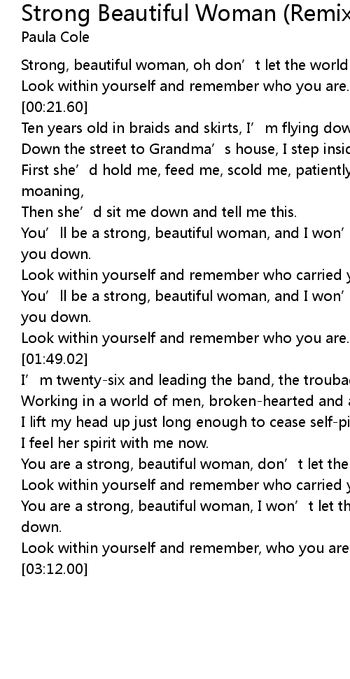 | [00:00.00] | Strong, beautiful woman, oh don’t let the world let you down, |
