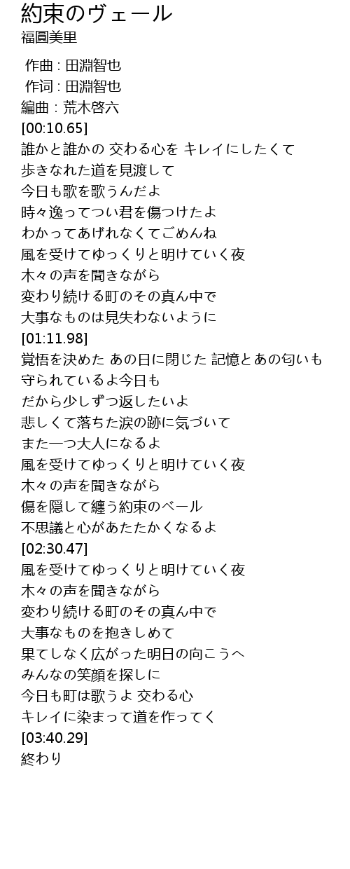 | [02:17.16] | 傷を隠して纏う約束のベール |