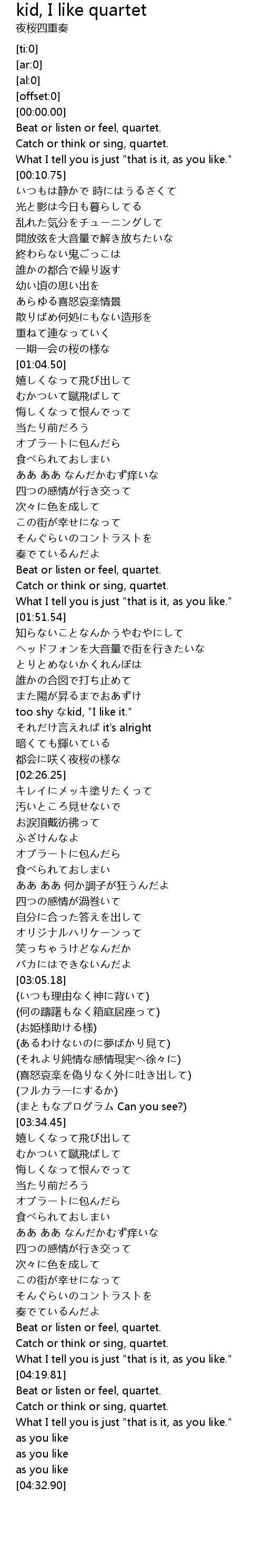 | [04:20.57] | Beat or listen or feel, quartet. |
