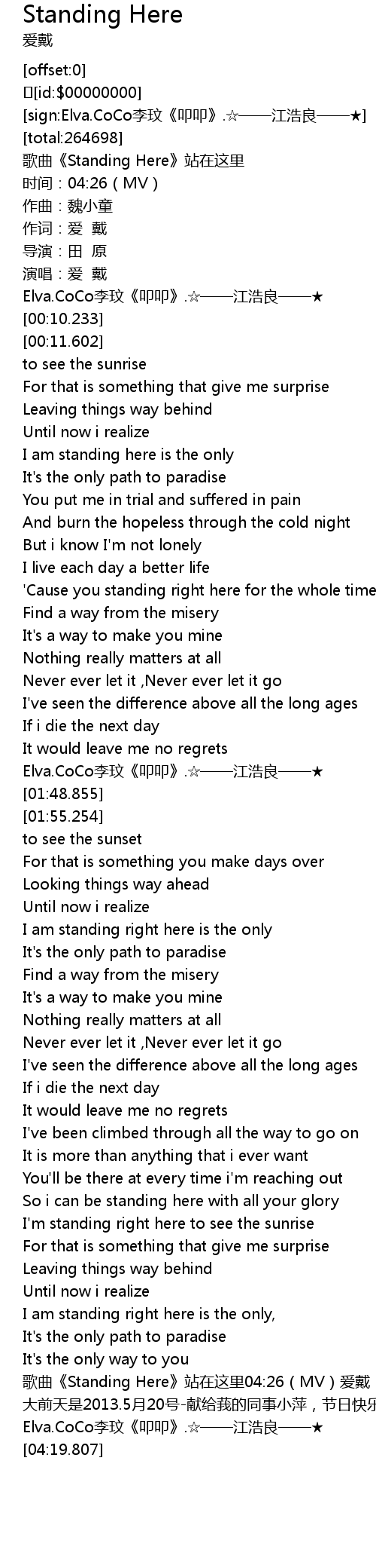 | [04:17.268] | ge qu Standing Here zhan zai zhe li 04: 26 MV ai dai |