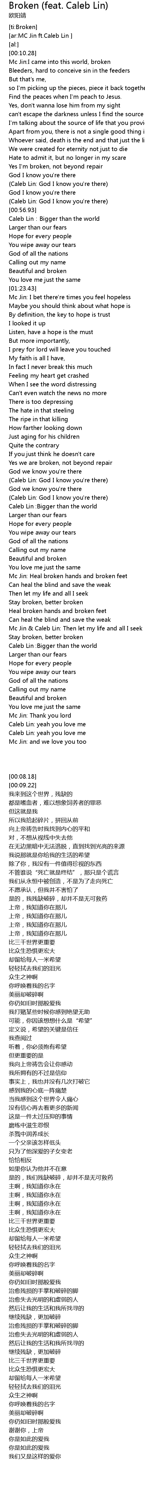 | [00:12.54] | Mc Jin: I came into this world, broken |
