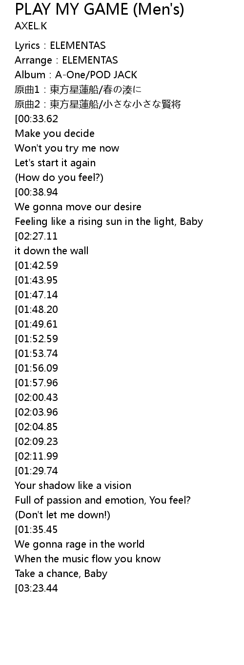 | [02:48.99][01:52.59][00:56.04][02:49.22][01:52.87][00:56.32] | Play my game! |