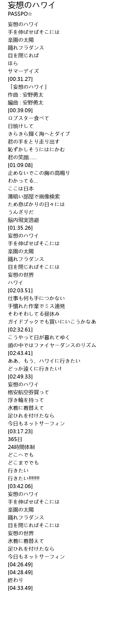 | [00:33.09] | 「妄想のハワイ」 |