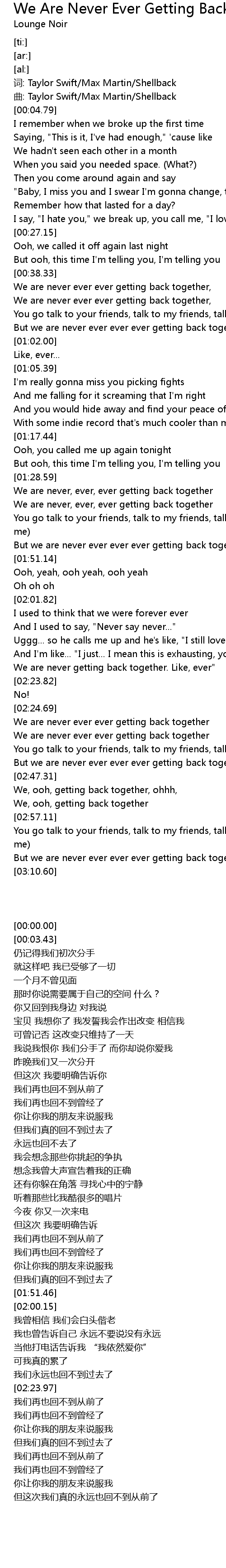 | [00:38.53] | We are never ever ever getting back together, |