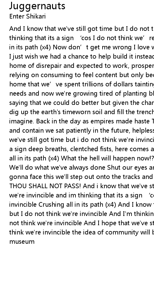 | And I know that we' ve still got time but I do not think we' re invincible and i' m thinking that its a sign ' cos I do not think we' re invincible Crushing all in its path x4 Now don' t get me wrong I love what you' ve done with the place I just wish we had a chance to help build it instead of just moving into this home of disrepair and expected to work, prosper and then share constantly relying on consuming to feel content but only because we lost touch with this home that we' ve spent trillions of dollars tainting for our wants and not our needs and now we' re growing tired of planting blearyeyed seeds And I' m not saying that we could do better but given the chance we' d try we' d try we dig up the earth' s timeworn soil and fill the trench with greedy eyes x2 imagine. Back in the day as empires made haste To colonize, to claim, to control and contain we sat patiently in the future, helpless SWITCH! And i know that we' ve still got time but i do not think we' re invincible and i think that it is a sign deep breaths, clentched fists, here comes another juggernaut! Crushing all in its path x4 What the hell will happen now!? I really don' t know man! We' ll do what we' ve always done Shut our eyes and hope for the best? NO! We' re gonna face this we' ll step out onto the tracks and stare it right in the face THOU SHALL NOT PASS! And i know that we' ve still got time but i do not think we' re invincible and im thinking that its a sign ' cos i do not think we' re invincible Crushing all in its path x4 And I know that we' ve still got time but I do not think we' re invincible And I' m thinking that its a sign And I do not think we' re invincible And I hope that we' ve still got time but I do not think we' re invincible the idea of community will be something displayed at a museum |
