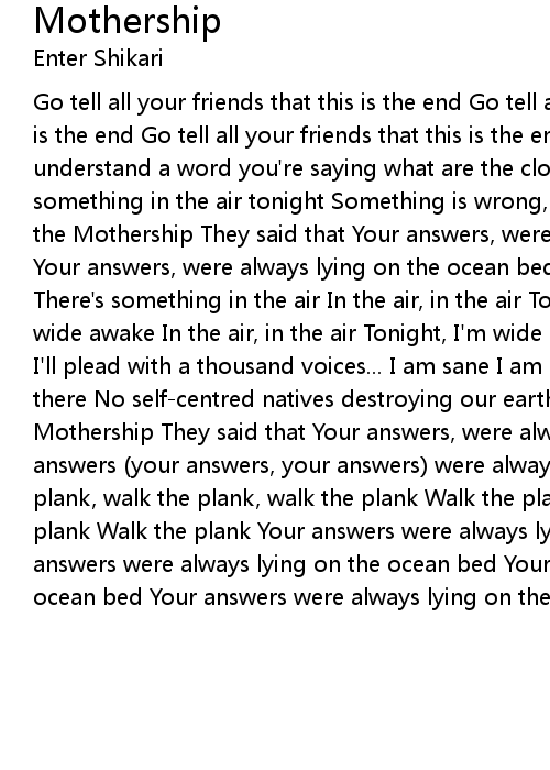 Go tell all your friends that this is the end Go tell all your friends that this is the end Go tell all your friends that this is the end This is the end I don't understand a word you're saying what are the clouds running from? There's something in the air tonight Something is wrong, spit it out! I just fell from the Mothership They said that Your answers, were always lying on the ocean bed Your answers, were always lying on the ocean bed There's something in the air There's something in the air In the air, in the air Tonight, I'm wide awake, I'm wide awake In the air, in the air Tonight, I'm wide awake, I'm wide awake And I'll plead with a thousand voices... I am sane I am sane My soul felt so safe up there No self-centred natives destroying our earth I just fell from the Mothership They said that Your answers, were always lying on the ocean bed Your answers (your answers, your answers) were always lying on the ocean bed Walk the plank, walk the plank, walk the plank Walk the plank, walk the plank, walk the plank Walk the plank Your answers were always lying on the ocean bed Your answers were always lying on the ocean bed Your answers were always lying on the ocean bed Your answers were always lying on the ocean bed |