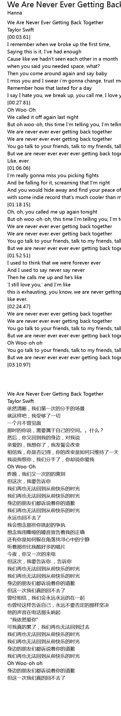 | [00:01.03] | We Are Never Ever Getting Back Together |