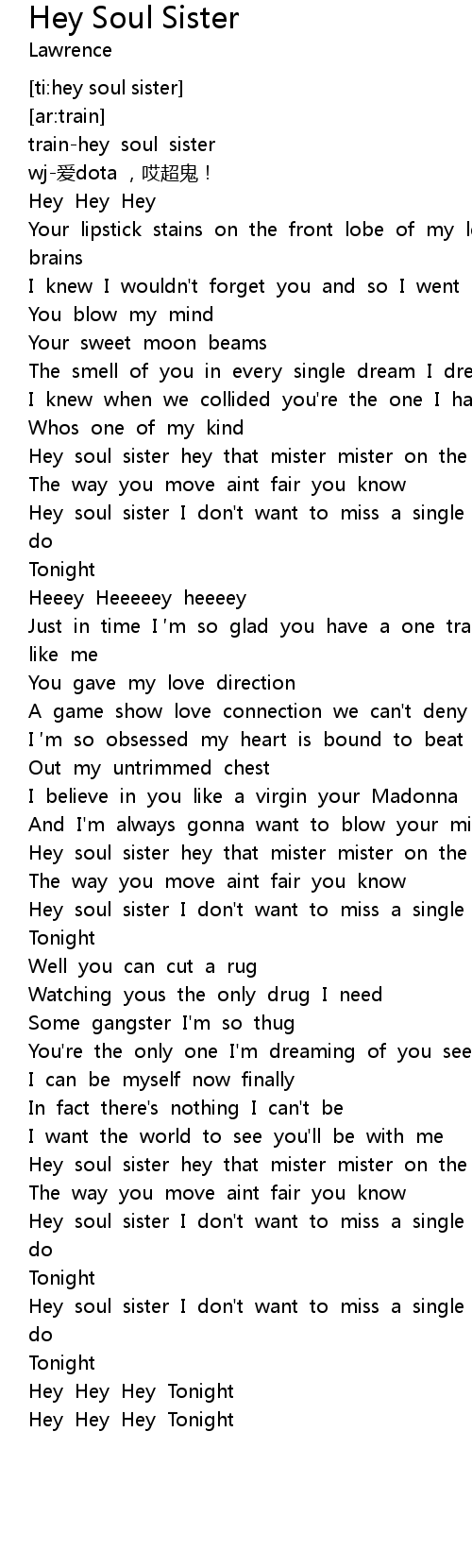 | [02:11.11] | Hey soul sister I don't want to miss a single thing you do |