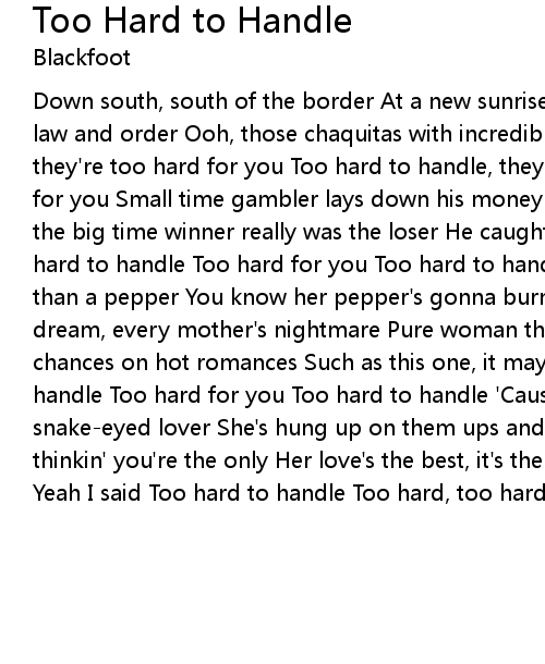 Down south, south of the border At a new sunrise where the Workin' woman hates law and order Ooh, those chaquitas with incredible thighs Too hard to handle, they're too hard for you Too hard to handle, they're too hard They're too tough for you Small time gambler lays down his money To play some five card stud But the big time winner really was the loser He caught a case of a unlucky love Too hard to handle Too hard for you Too hard to handle 'Cause sweet Lolita's hotter than a pepper You know her pepper's gonna burn you in two She's a young man's dream, every mother's nightmare Pure woman through and through Don't take no chances on hot romances Such as this one, it may happen to you Too hard to handle Too hard for you Too hard to handle 'Cause there's no future with a snake-eyed lover She's hung up on them ups and downs But if you're lonely, thinkin' you're the only Her love's the best, it's the hottest in town, ah yes Yeah I said Too hard to handle Too hard, too hard |