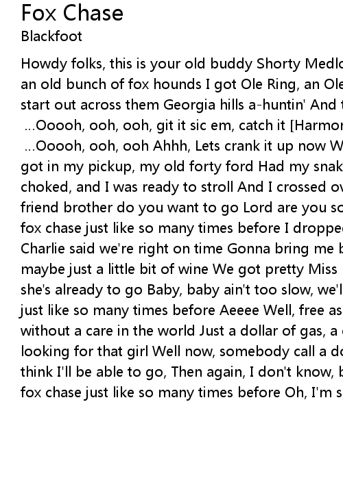 | Howdy folks, this is your old buddy Shorty Medlocke I'd like to tell you about an old bunch of fox hounds I got Ole Ring, an Ole Tige and Ole Rover And when we start out across them Georgia hills a-huntin' And them foxes sound something like this [Harmonica] …Ooooh, ooh, ooh, git it sic em, catch it [Harmonica] …Get em Ring. [Harmonica] …Ooooh, ooh, ooh Ahhh, Lets crank it up now Well I got in my pickup, my old forty ford Had my snake skins on, and my black hat choked, and I was ready to stroll And I crossed over into Jackson, said to my friend brother do you want to go Lord are you so slow, We'll be out doing the fox chase just like so many times before I dropped a glass of tea and Gomez De, Charlie said we're right on time Gonna bring me black jack some one on one and maybe just a little bit of wine We got pretty Miss Lucy bring your live gun she's already to go Baby, baby ain't too slow, we'll be out doing the fox chase just like so many times before Aeeee Well, free as a breeze, do what we please without a care in the world Just a dollar of gas, a one night of romance, were looking for that girl Well now, somebody call a doctor, sick on my knees, don't think I'll be able to go, Then again, I don't know, but I'll be out doing the fox chase just like so many times before Oh, I'm seeing them foxes |
