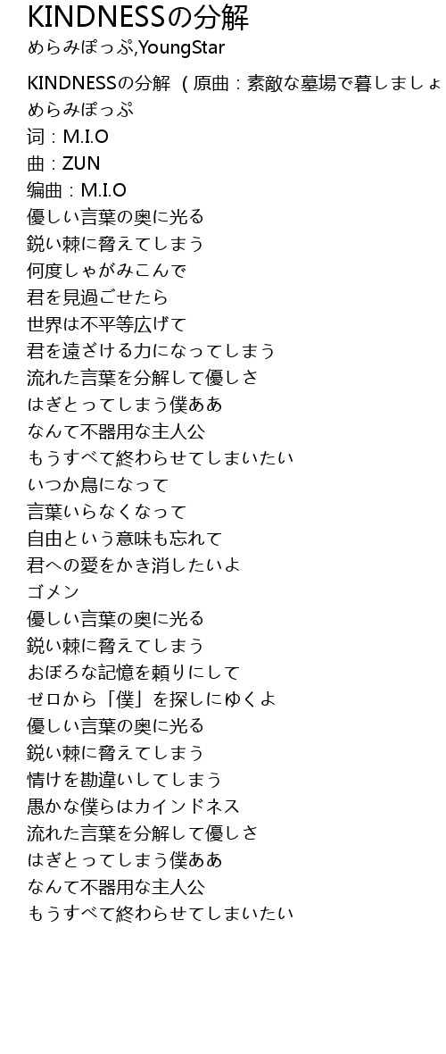 | [00:00.10] | KINDNESSの分解 (原曲:素敵な墓場で暮しましょ) - めらみぽっぷ |