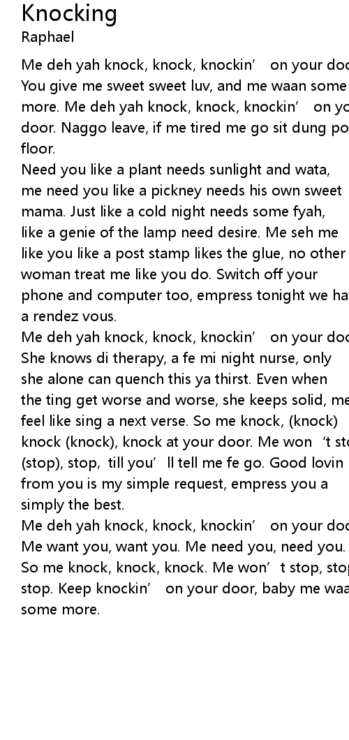 | Me deh yah knock, knock, knockin' on your door. | |