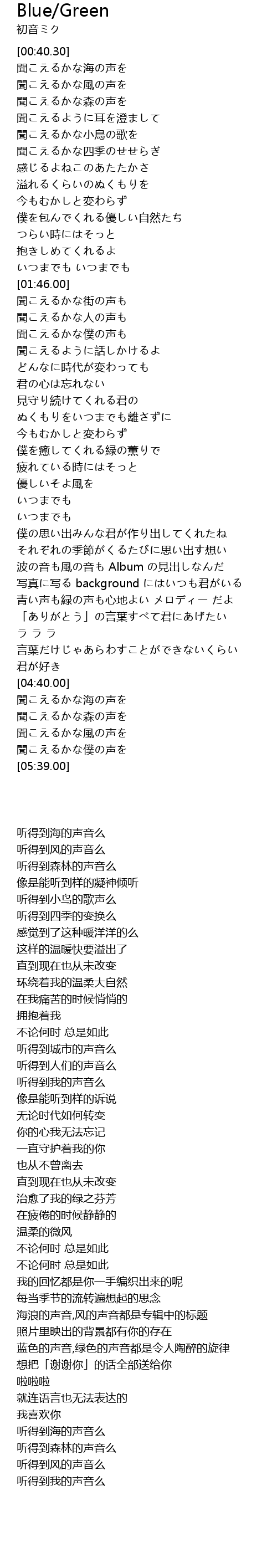 | [04:06.89] | 青い声も緑の声も心地よい メロディー だよ |