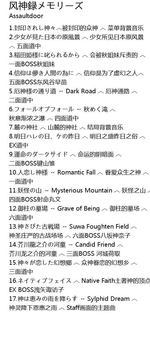 | [06:08.51] | 10.人恋し神様 ~ Romantic Fall ︿ 眷爱众生之神 ︿ 一面道中 |