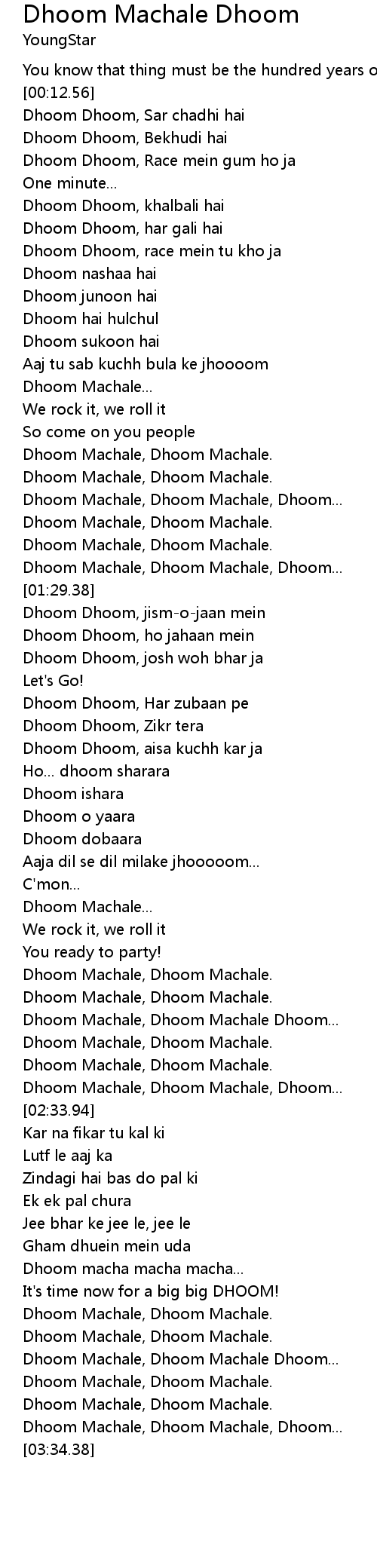 | [03:16.46] | Dhoom Machale, Dhoom Machale. |