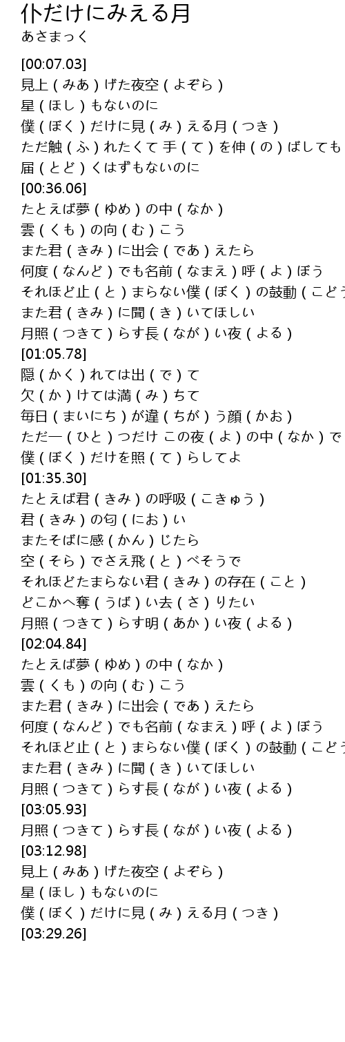 | [03:21.63] | 僕(ぼく)だけに見(み)える月(つき) |