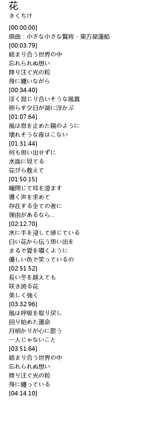 | [00:00.10] | 原曲:小さな小さな賢将 - 東方星蓮船 |