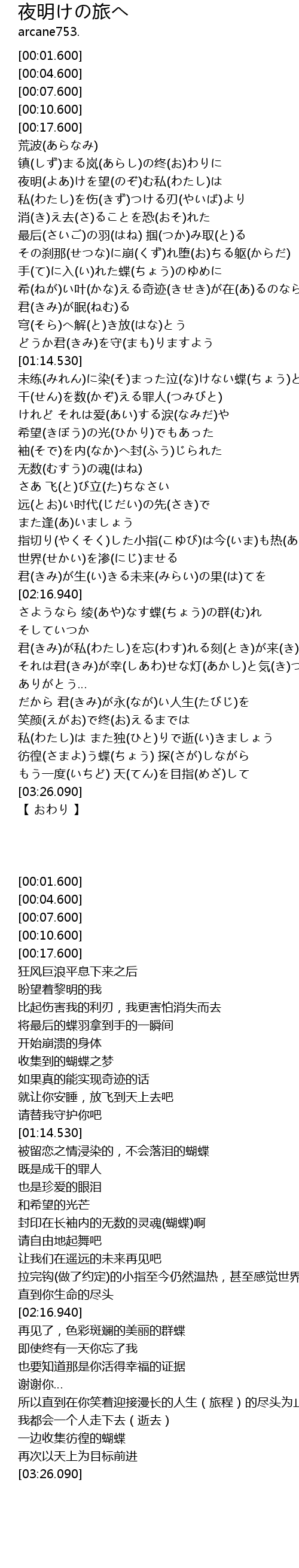 | [02:24.760] | さようなら 绫(あや)なす蝶(ちょう)の群(む)れ |
