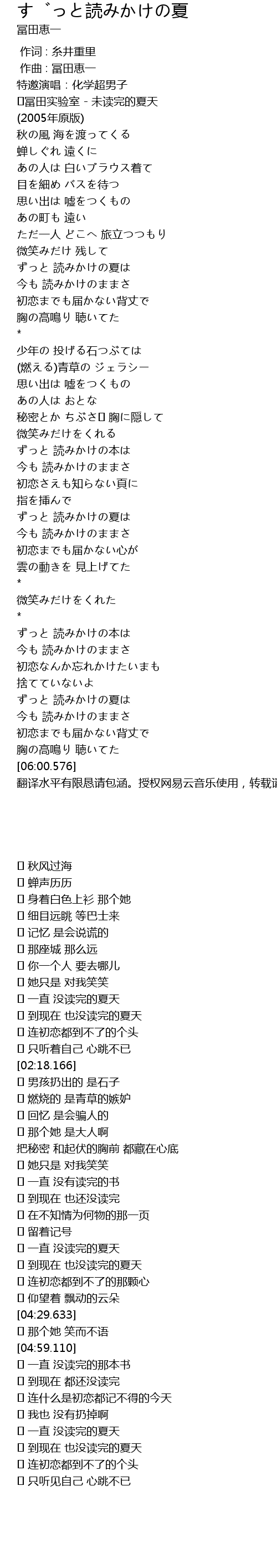 | [00:06.493] | ♪冨田实验室 - 未读完的夏天 |
