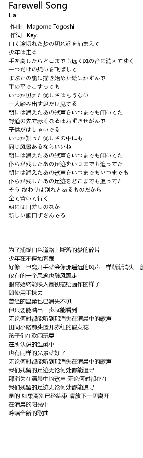 | [02:39.720] | 朝には消えたあの歌声をいつまでも闻いてた |