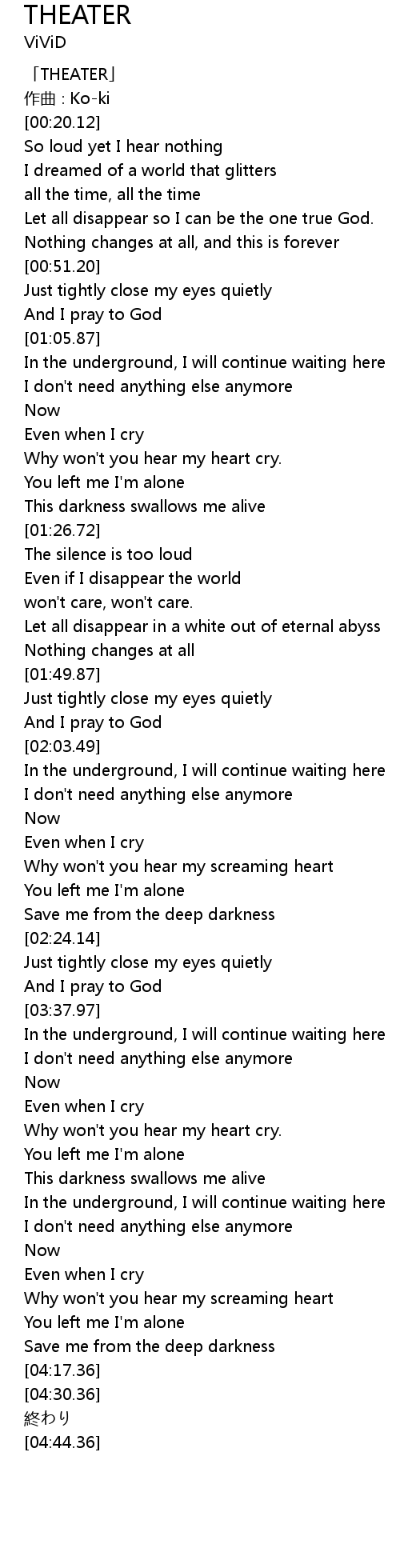 | [00:35.25] | Let all disappear so I can be the one true God. |