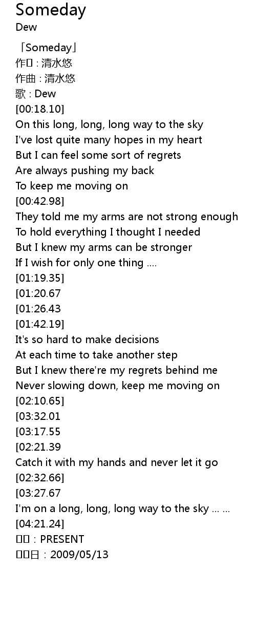 | [03:42.15][03:32.01][03:12.16][02:11.32] | I' ll find a gleam in the sky |