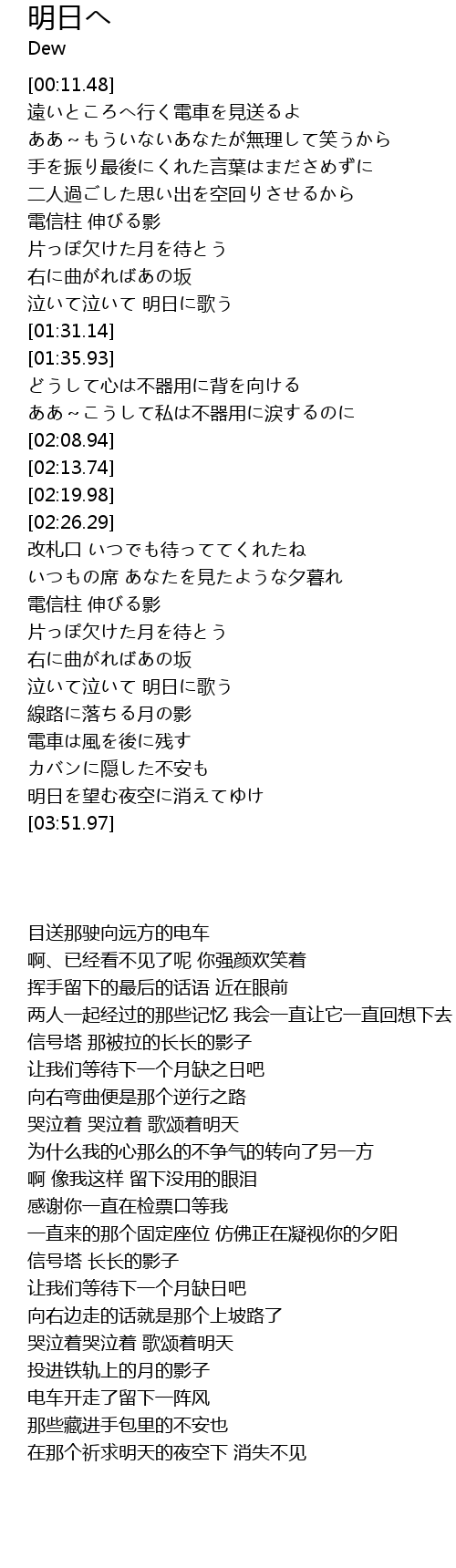| [01:22.72] | 泣いて泣いて 明日に歌う |