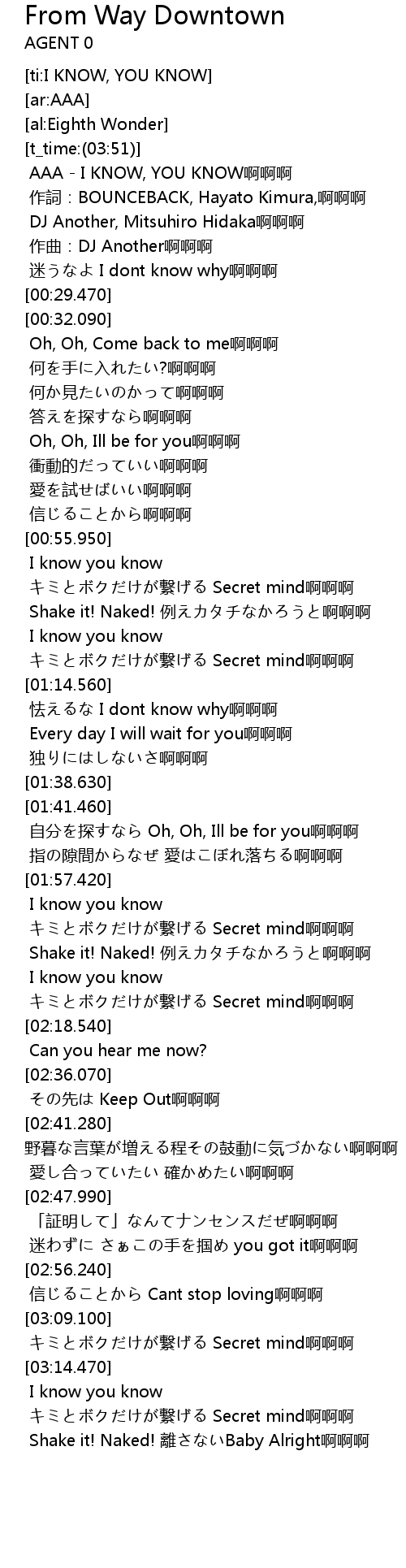 | [00:00.000] | AAA - I KNOW, YOU KNOW啊啊啊 |