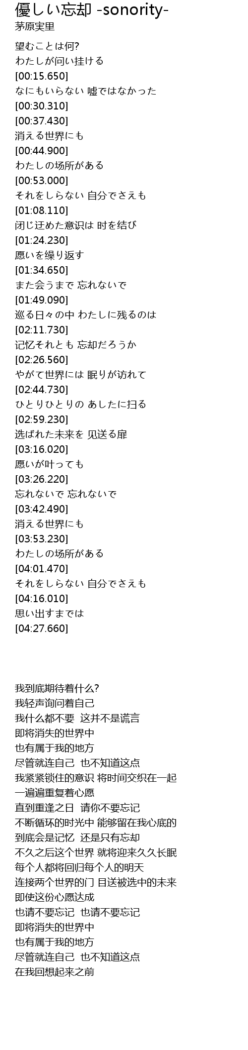 | [00:17.290] | なにもいらない 嘘ではなかった |