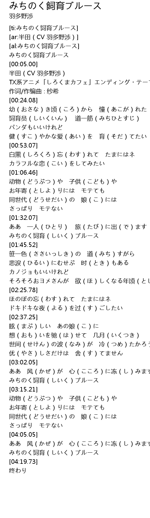 | [04:12.46] | みちのく饲育(しいく)ブルース |