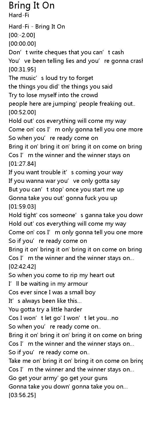 | [03:14.28] | Bring it on' bring it on' bring it on come on bring it on |