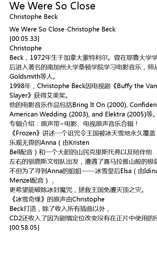 | [00:01.70] | We Were So CloseChristophe Beck |