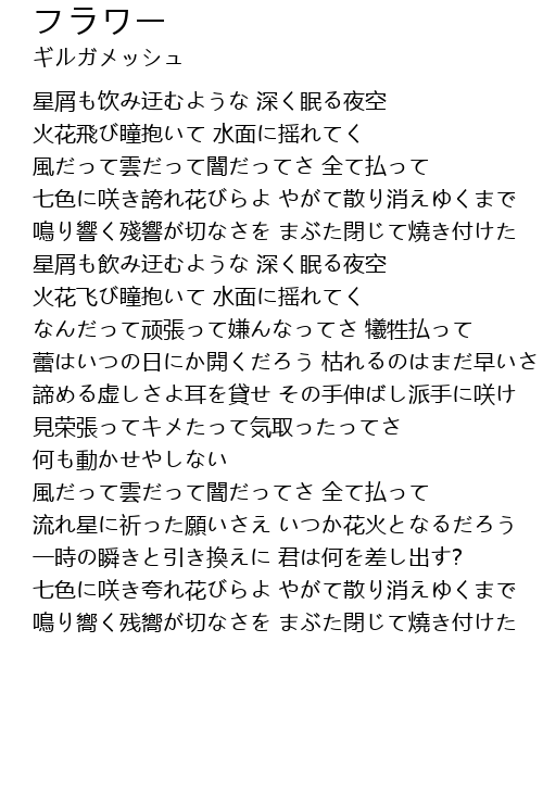 | [00:47.19] | 七色に咲き誇れ花びらよ やがて散り消えゆくまで |