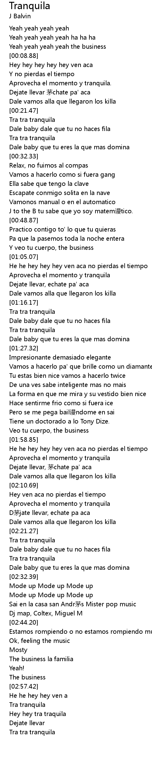 | [03:00.53] | Hey hey tra traquila |