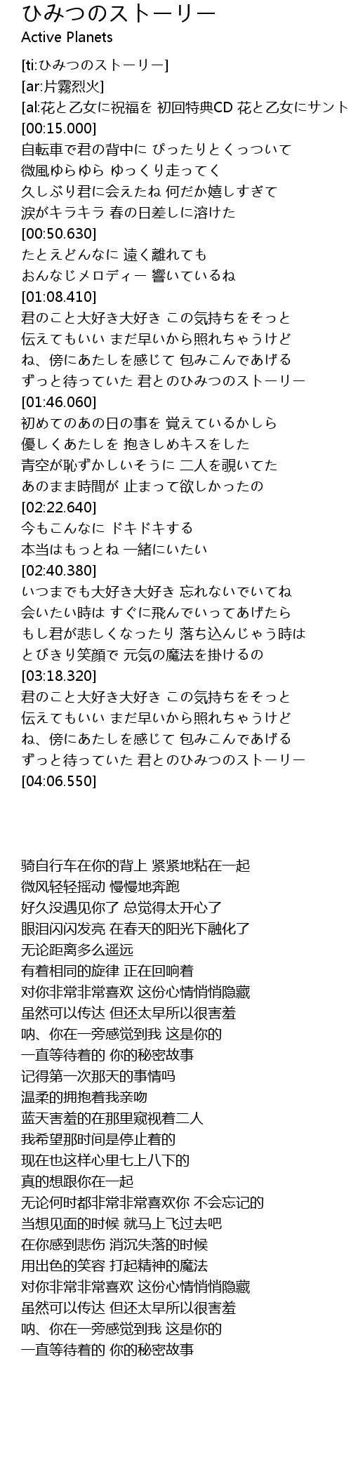 | [03:53.870] | ずっと待っていた 君とのひみつのストーリー |