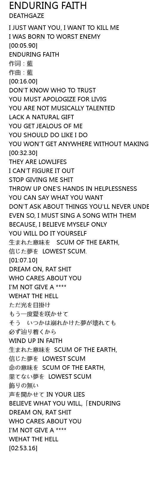 | [02:30.85] | BELIEVE WHAT YOU WILL, ENDURING |