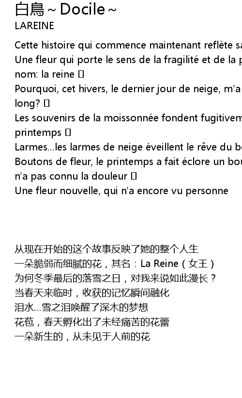 | [00:19.437] | Une fleur qui porte le sens de la fragilite et de la pre cision, son nom: la reine |