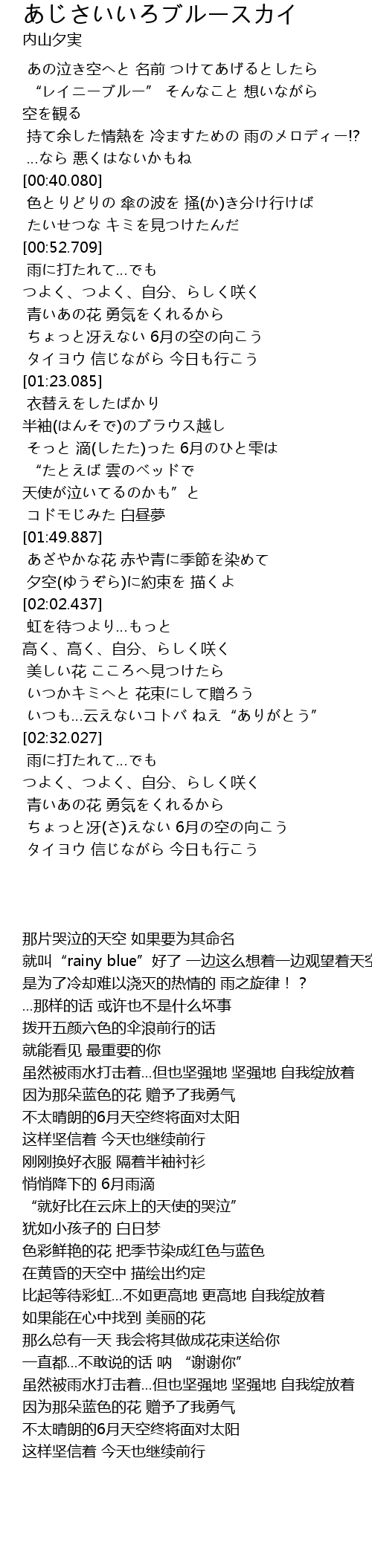 | [02:02.775] | 虹を待つより…もっと 高く、高く、自分、らしく咲く |