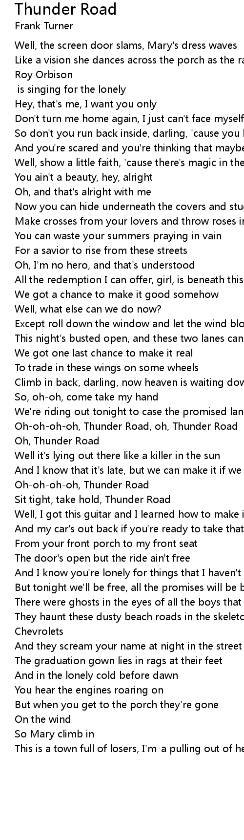 Oh-oh-oh-oh, Thunder Road, oh, Thunder Road |