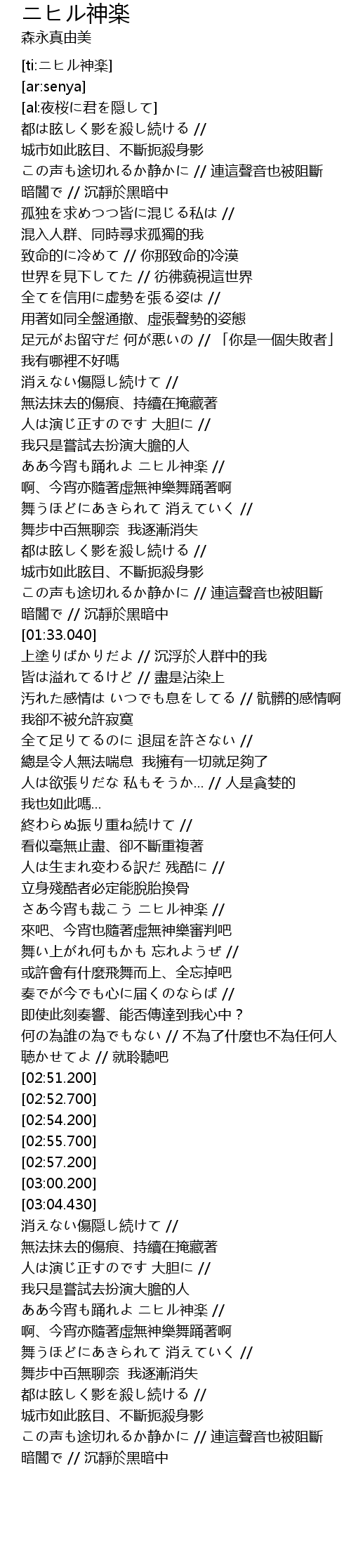 | [03:32.980] | ああ今宵も踊れよ ニヒル神楽 // 啊、今宵亦隨著虛無神樂舞踊著啊 |