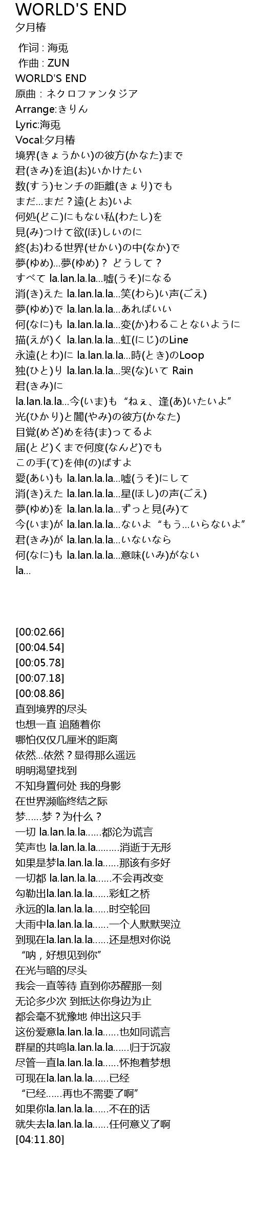 | [00:37.90] | 終(お)わる世界(せかい)の中(なか)で |