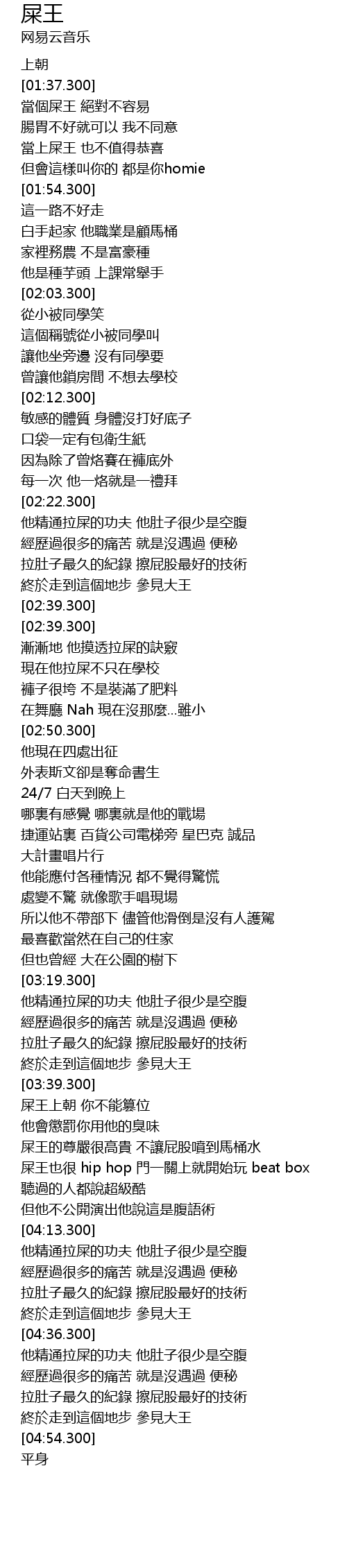 | [04:08.160] | 屎王也很 hip hop 門一關上就開始玩 beat box |